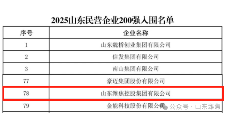 近日,山东省工商联、省发展改革委、省科技厅、省人力资源社会保障厅、省农业农村厅、省商务厅、省税务局、省市场监管局、省总商会共同组织开展了2025山东民营企业百强系列榜单发布活动。山东潍焦控股集团有限公司荣登“2025山东民营企业200强”第78位。